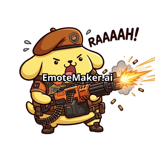brimstone from valorant but as pompompurin from hello kitty holding an odin while shooting