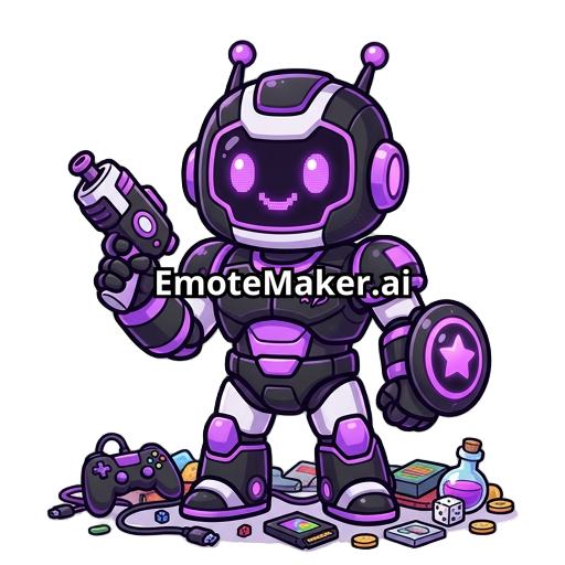 generic robot, toy robot, mostly black body, childish mascot, purple background, weapon, clutter, bulky armor
