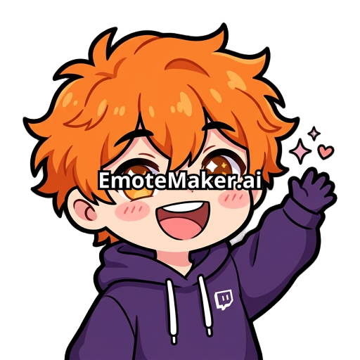 A high-quality Twitch emote of a cute chibi boy with messy bright orange hair and amber eyes, wearing a dark purple oversized hoodie. Expressive facial expression: Happy. White background, thick clean outlines, vibrant colors, vector art style, 2D flat design