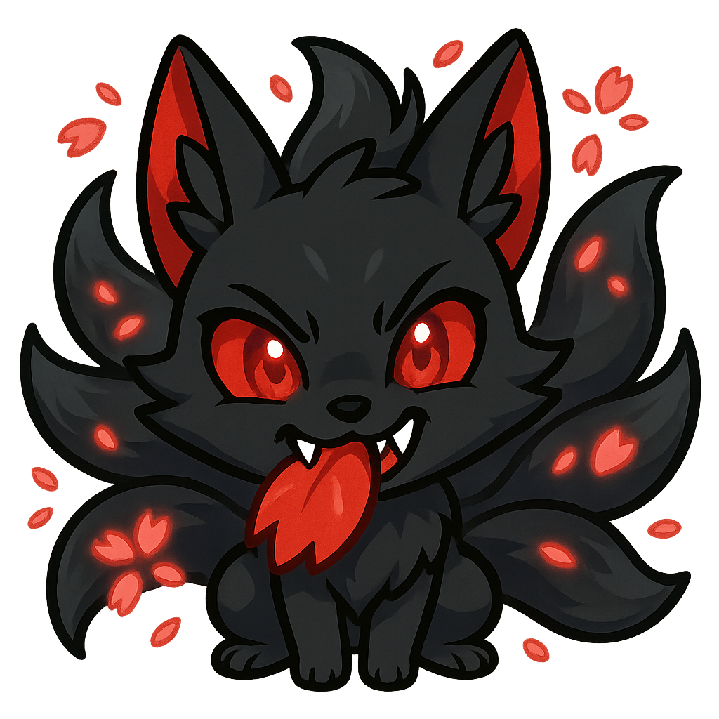 A mischievous black-bodied kitsune with shimmering red eyes and striking red ear tips, nine tails fanning out behind it with luminous red sakura petals swirling around biting