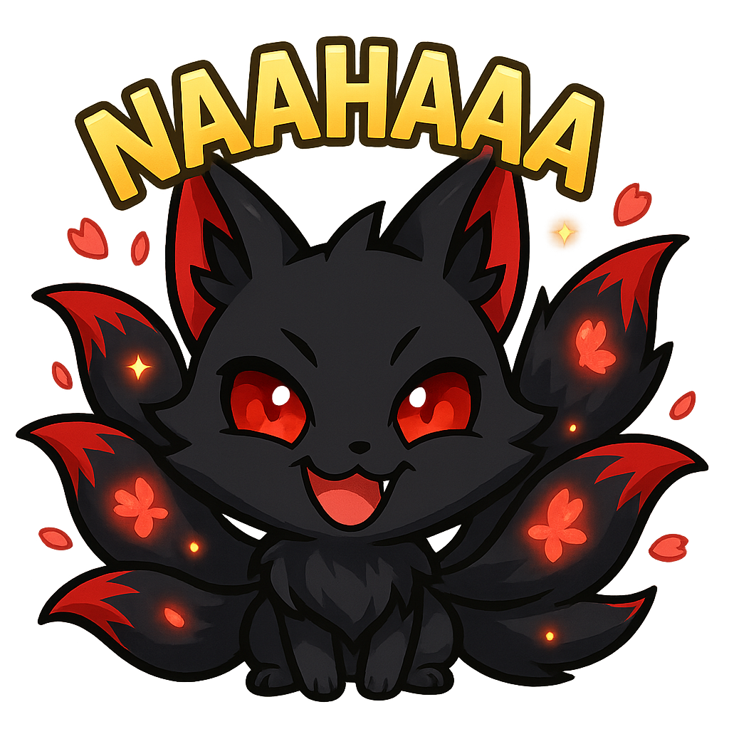 A mischievous black-bodied kitsune with shimmering red eyes and striking red ear tips, nine tails fanning out behind it with luminous red sakura petals swirling around with golden text Naahaaa. And the face with it