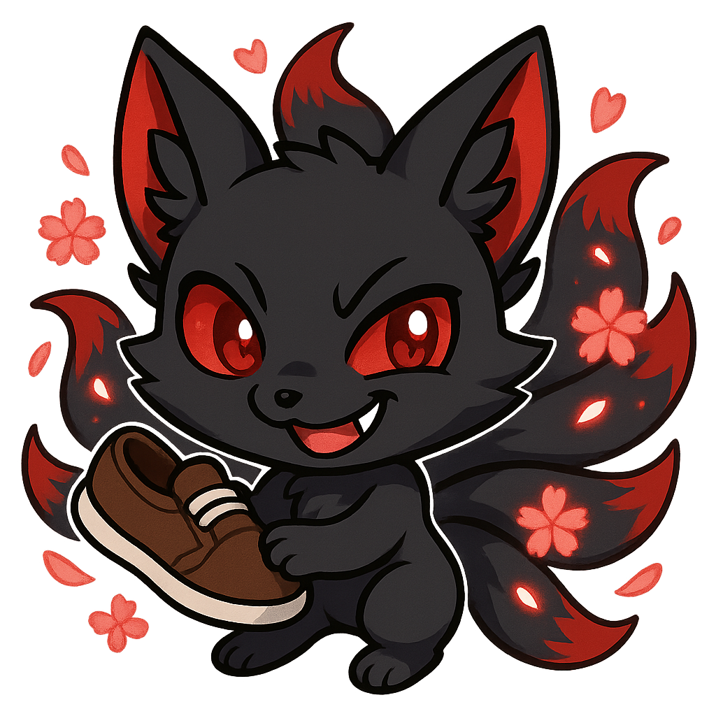 A mischievous black-bodied kitsune with shimmering red eyes and striking red ear tips, nine tails fanning out behind it with luminous red sakura petals swirling around with the kitsune holding a shoe