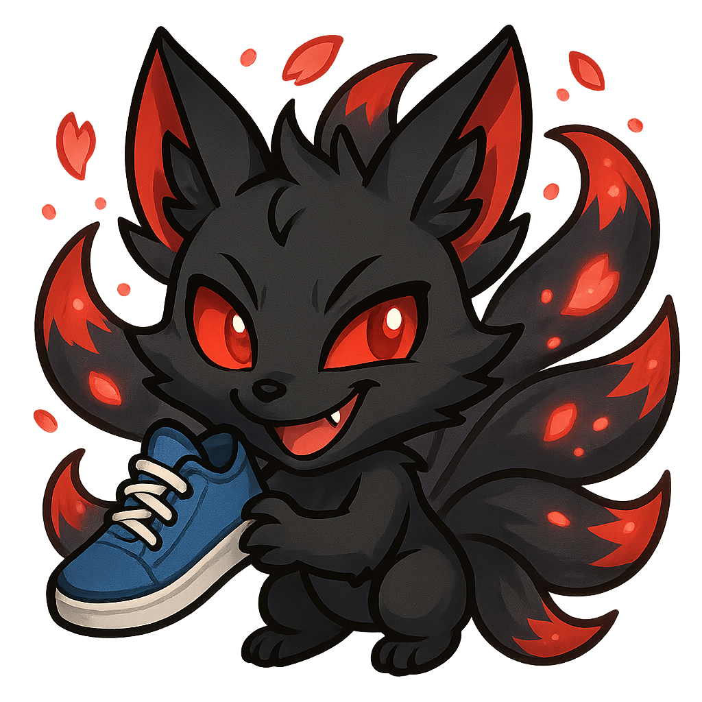 A mischievous black-bodied kitsune with shimmering red eyes and striking red ear tips, nine tails fanning out behind it with luminous red sakura petals swirling around with the kitsune holding a blue sneaker shoe