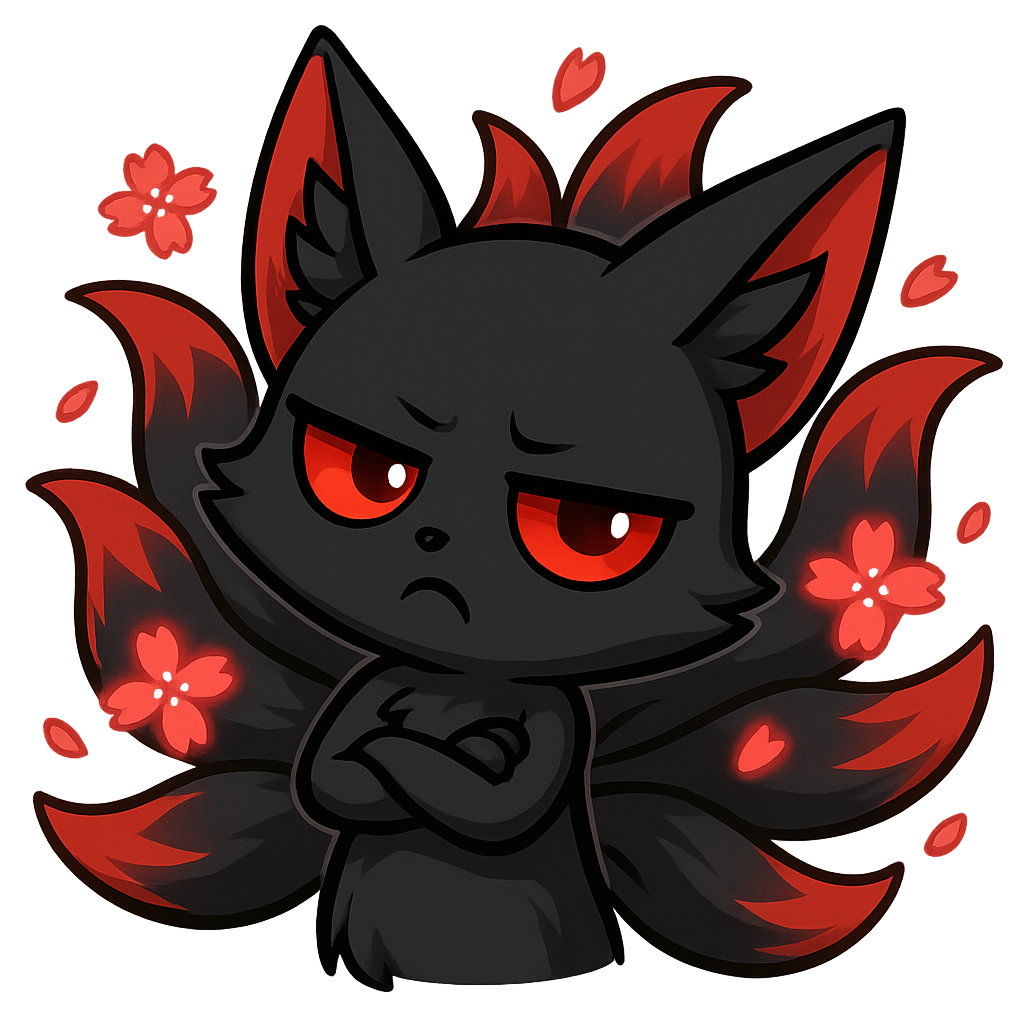 A mischievous black-bodied kitsune with shimmering red eyes and striking red ear tips, nine tails fanning out behind it with luminous red sakura petals swirling around with the kitsune there head tiled fully to the right and crosses there arms. looking judging