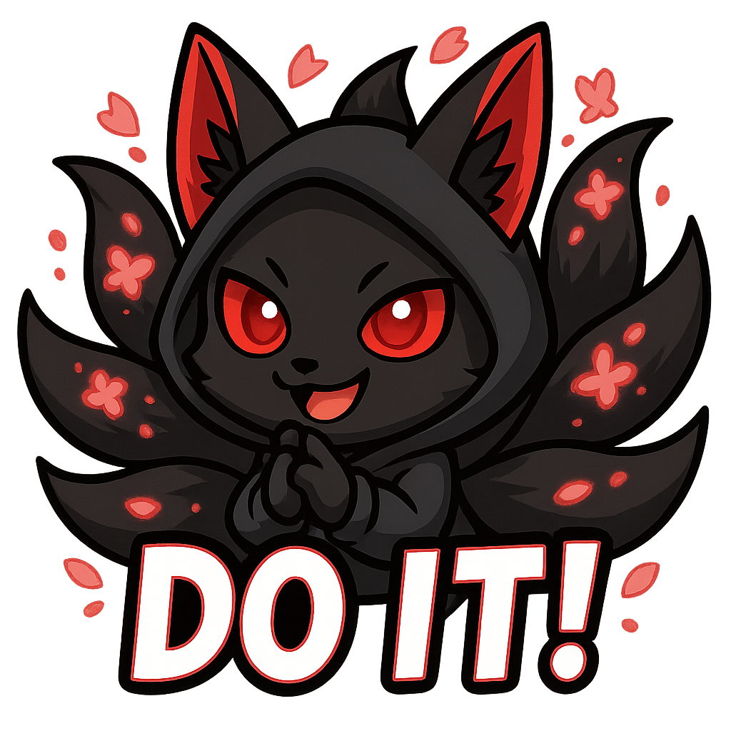 A mischievous black-bodied kitsune with shimmering red eyes and striking red ear tips, nine tails fanning out behind it with luminous red sakura petals swirling around shady with a hoody on and in text Do it!
