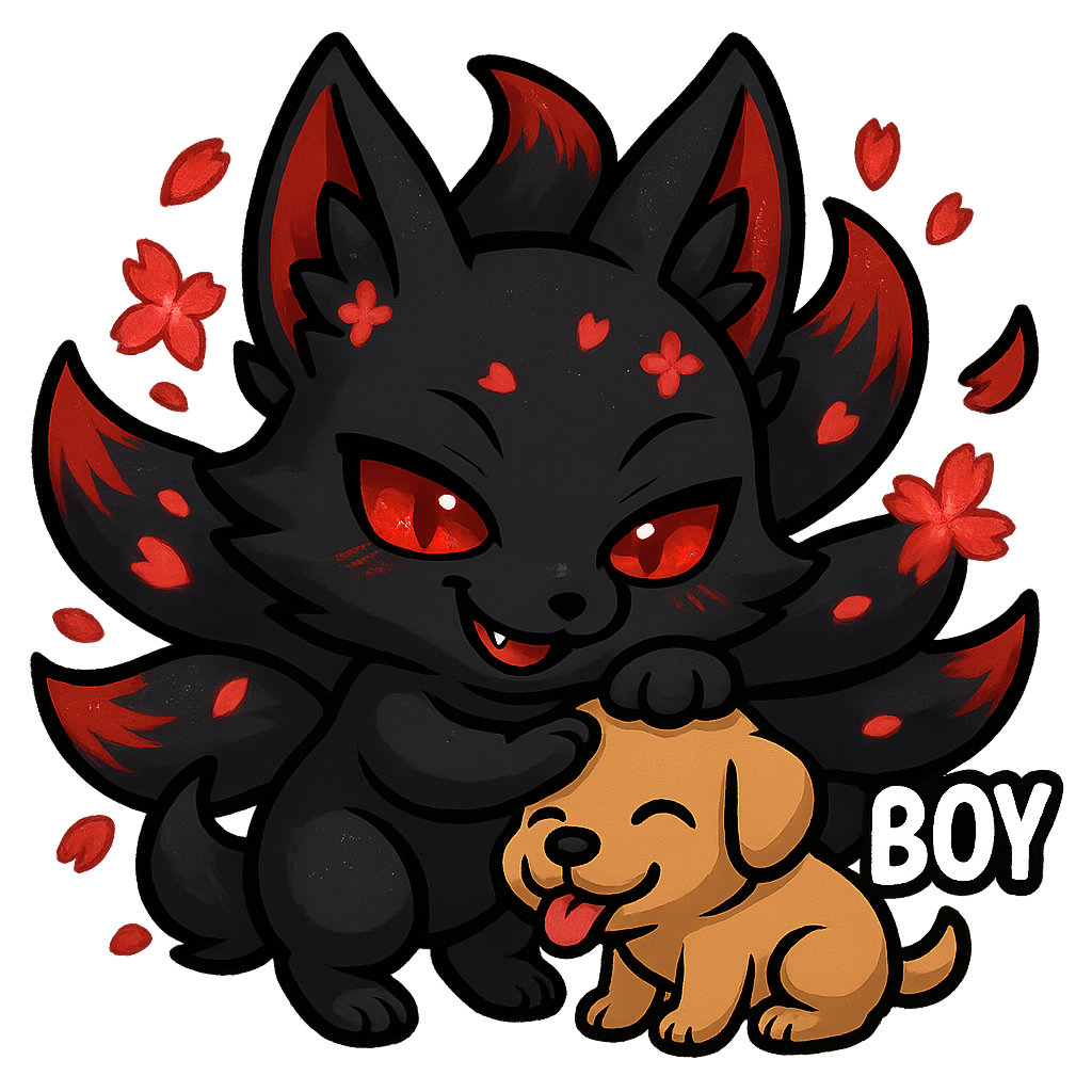 A mischievous black-bodied kitsune with shimmering red eyes and striking red ear tips, nine tails fanning out behind it with luminous red sakura petals swirling around Pets a puppy saying GoodBoy