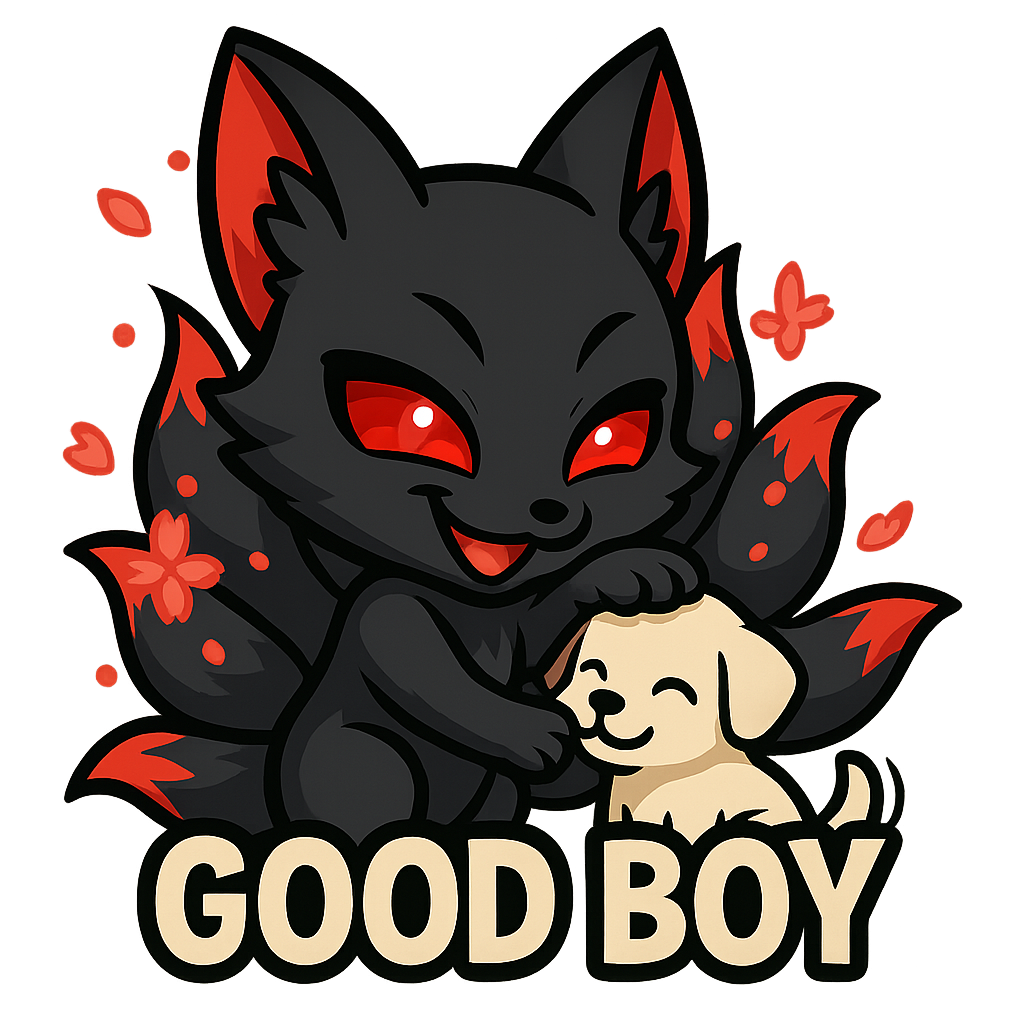 A mischievous black-bodied kitsune with shimmering red eyes and striking red ear tips, nine tails fanning out behind it with luminous red sakura petals swirling around Pets a puppy saying Good Boy
