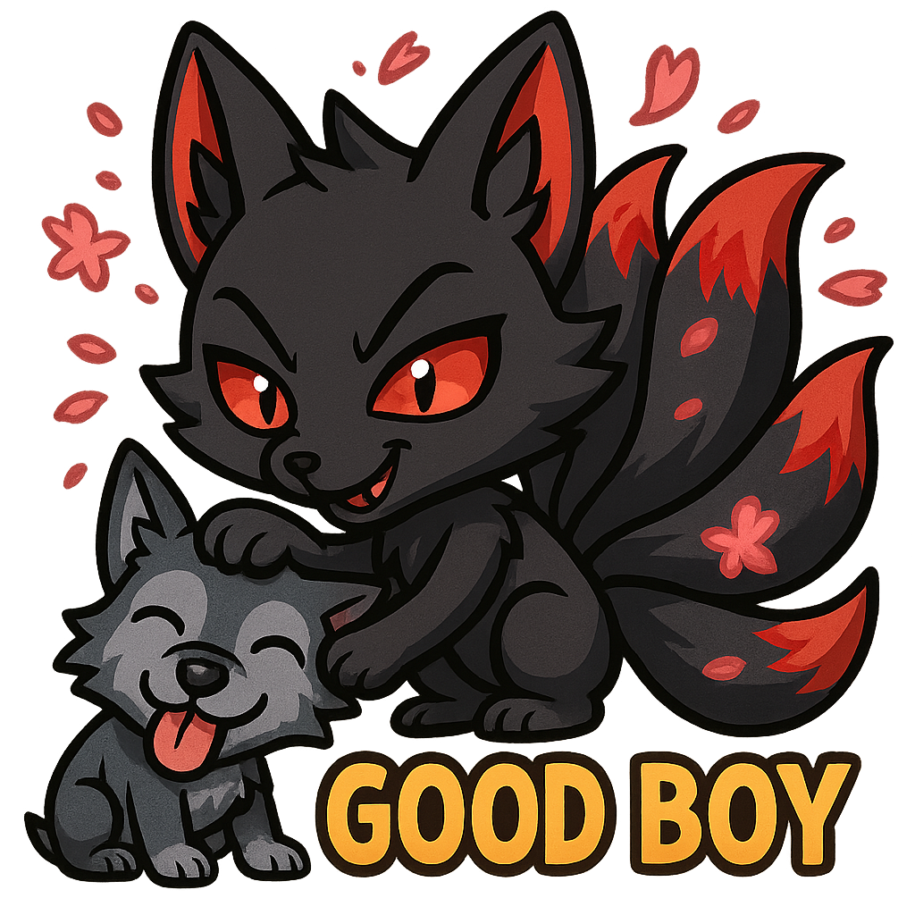 A mischievous black-bodied kitsune with shimmering red eyes and striking red ear tips, nine tails fanning out behind it with luminous red sakura petals swirling around Pets a puppy saying Good Boy . The kitsune dressed in a / pet form and the dog a were wolf