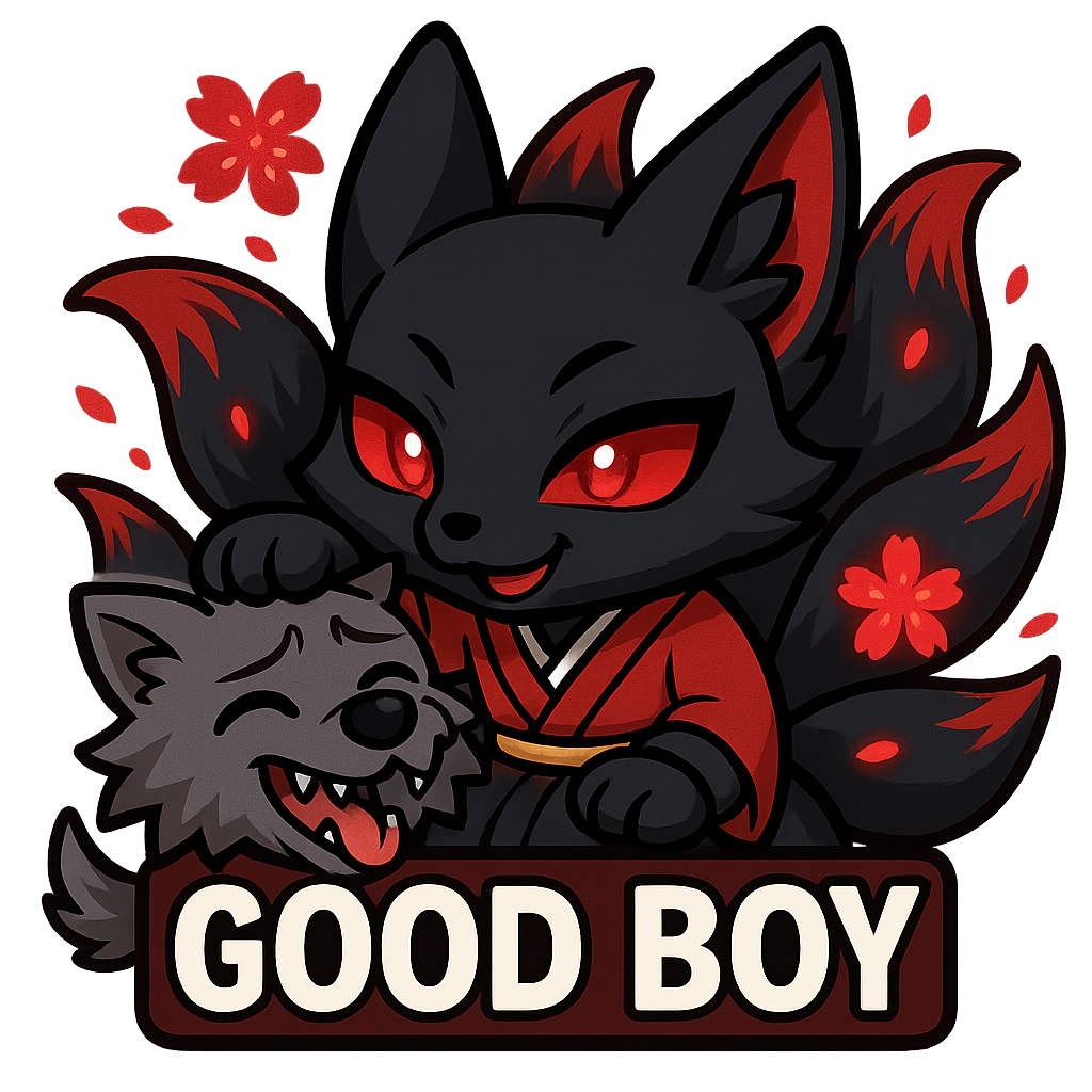 A mischievous black-bodied kitsune with shimmering red eyes and striking red ear tips, nine tails fanning out behind it with luminous red sakura petals swirling around Pets a puppy saying Good Boy . The kitsune dressed in a outfit/ pet form and the dog a werewolf